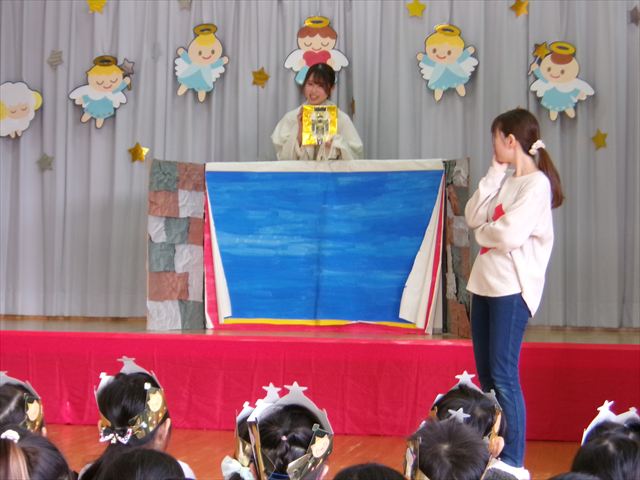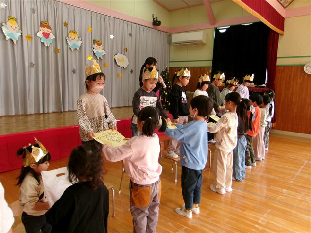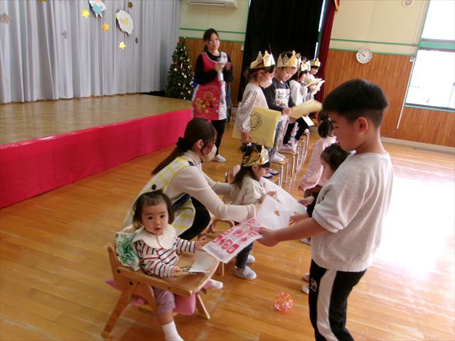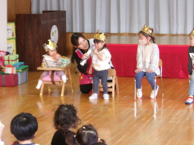 11月26日(水) お誕生日会が行われました。今月は9名のお友だちが誕生日を迎えました。感染症流行の時期ですが、11月生まれさん全員が無事に出席できよかったです。先生たちからのプレゼントは劇「金の斧 銀の斧~四ツ小屋Ver~」でした。発表会での年少組から年長組の劇を見て、今度は先生たちが!と張り切って準備していた先生たち。劇の中には発表会で登場したようなアイテムも出てきて、子どもたちは盛り上がっていました。