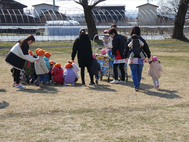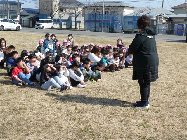 3月12日(木) 地震が起き火災が発生したという想定で避難訓練を行いました。戸外で遊んでいた子どもたちも、園内にいた子どもたちも保育教諭の誘導のもと素早く落ち着いて避難することができており、これまでの成果が感じられました。園長先生からは東日本大震災についてのお話もありました。当時のことは分からない子どもたちですが、真剣に耳を傾けていました。